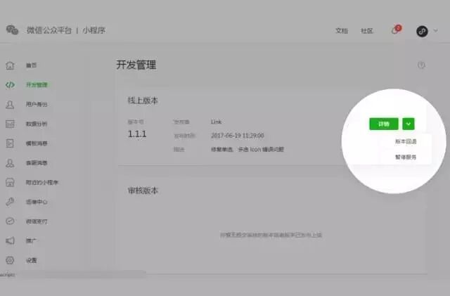 当小程序线上服务发生故障时,开发者可在“开发管理-线上版本”内选择回退版本,并恢复小程序正常服务。