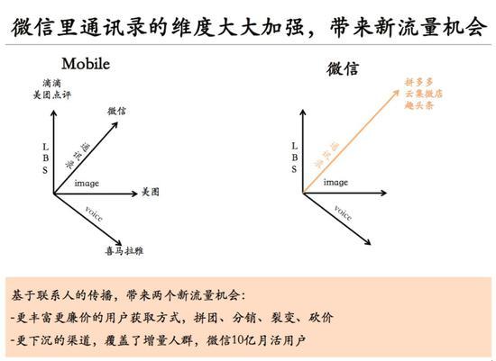 基于这样的关系链传播,拼多多、云集和趣头条等企业迅速崛起,而这背后其实是微信的流量机会。