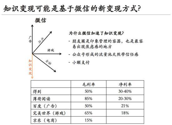 我们做一个猜想,知识变现会不会不是一个产品,而是一个基于微信的变现方式?微信里除了广告、电商、游戏、金融外,产生的第五种变现方式。