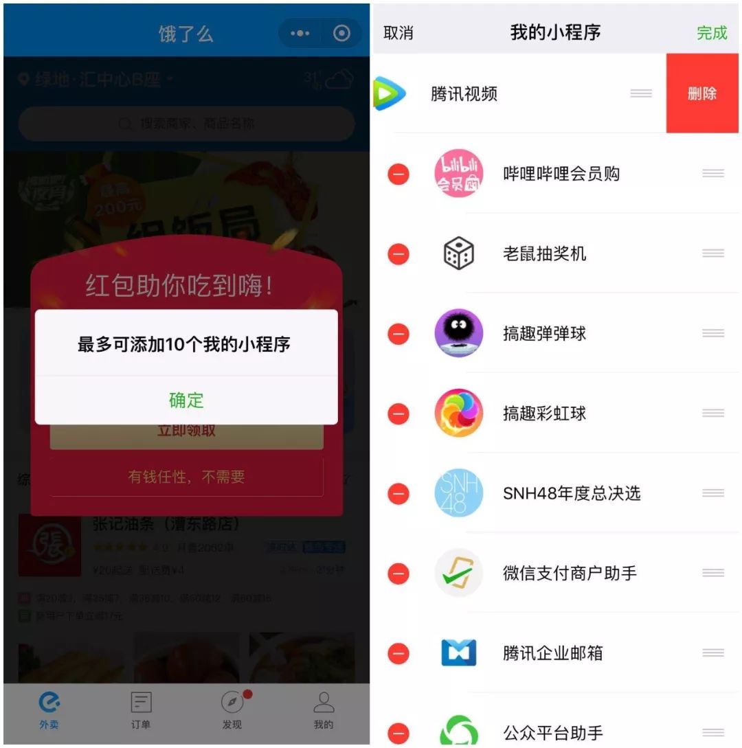 “我的小程序”最多可以添加10个小程序,数量和此前的星标相同。在“我的小程序”页面,用户可以根据需要调整小程序的排序,或删除小程序。